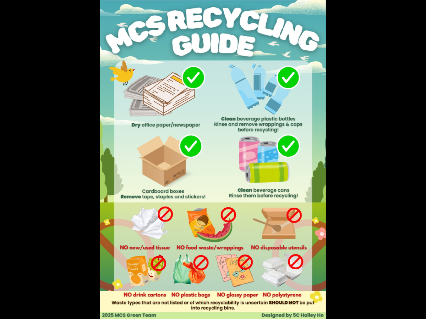 A poster, specially designed by one of the Student Environmental Protection Ambassadors, has also been placed next to our recycling facilities to raise awareness among fellow schoolmates about proper recycling practices and to promote responsible and considerate environmental stewardship.